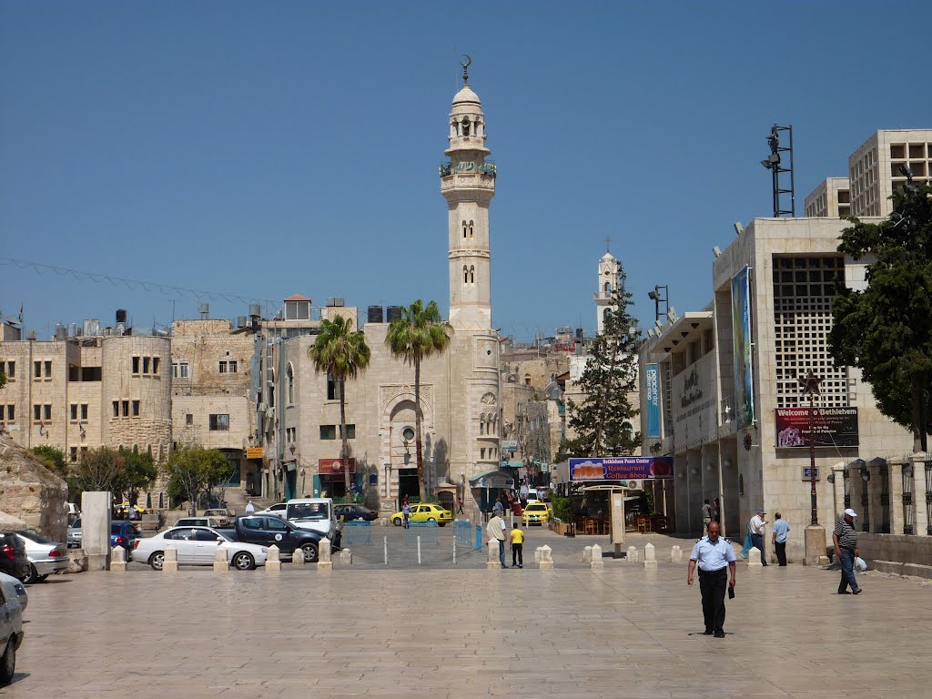La piazza di Betlemme si trova sulla sommità di una collina. Su questa sommità ci son tre cose notevoli: numero uno, la piazza affollata da turisti, tassisti, polizia palestinese e marmocchi che menano le mani; numero due, la Basilica della Natività del mio vecchio amico Gesù bambino; numero tre, la Moschea di Omar.