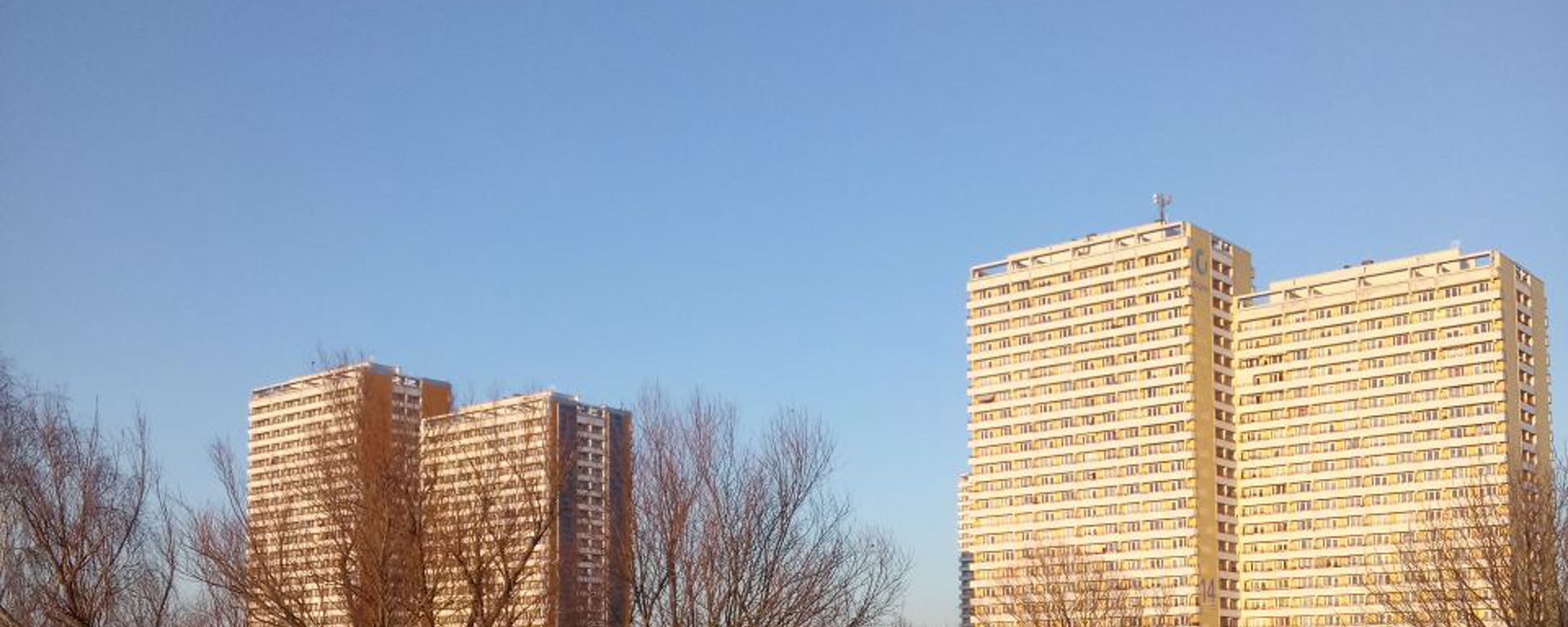 La sento pronunciare e subito vedo di fronte a me le schiere infinite di questi palazzi che sembrano costruiti con tanti blocchi di Lego incollati uno sopra l’altro sempre più in alto, quasi all’infinito – in un costante anelito verso il cielo, come i pinnacoli delle cattedrali gotiche (ma a differenza di queste, temo, senza essere scaturiti da fervore religioso né tantomeno da virtuosismi architettonici). Vedo le strisce arcobaleno ed i murales che ne decorano le facciate ritraendo allegre scene di vita in comune, con i bambini che corrono circondati da stuoli di farfalle, timidi tentativi di rendere meno grigio il panorama di questa città, che resta loro malgrado inevitabilmente grigio – per qualche strano fenomeno ottico, anche i palazzi che si sbizzarriscono in tonalità di azzurro, blu e perfino arancione non riescono che a dare l’impressione di monotonale grigiore.