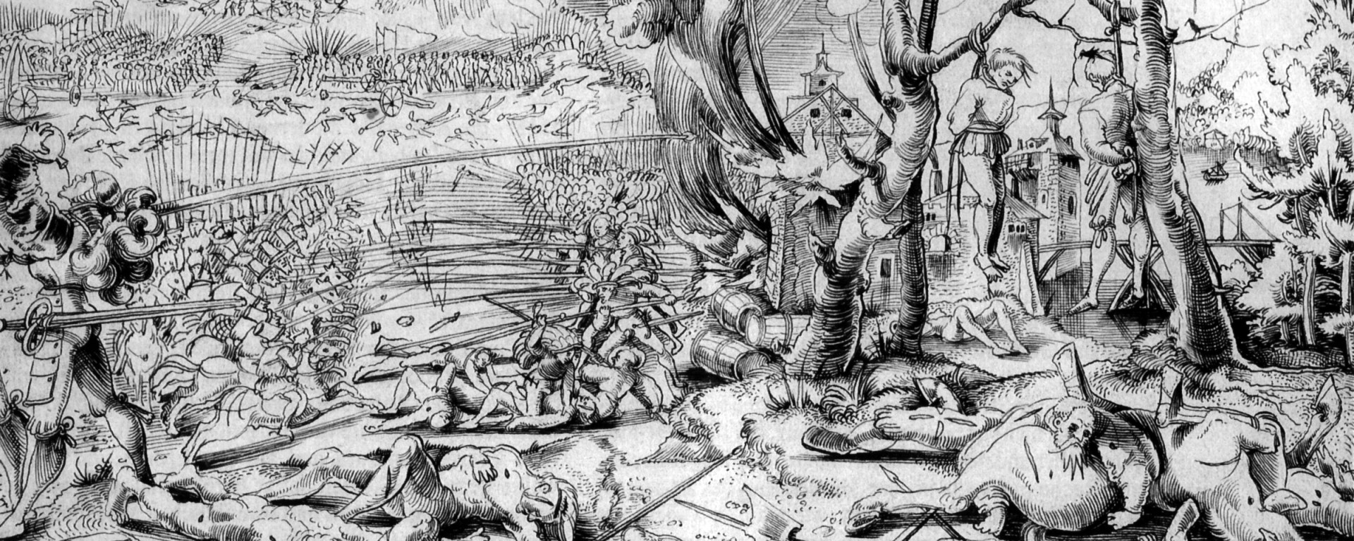 Oggi, come avrete notato, non ci troviamo a Venezia, ma nelle campagne di Marignano, l’attuale Melegnano, una località poco lontana da Milano. In una giornata qualunque, davanti ai nostri occhi ci apparirebbero prati, alberi e giusto qualche casa in lontananza, verso il paese: questa però non è una giornata qualunque, e al nostro sguardo essa offre uno spettacolo molto meno bucolico del solito. I prati sono ricoperti di corpi, a migliaia, accompagnati dalle urla più o meno sommesse dei feriti non ancora soccorsi; sulle fronde degli alberi si trovano degli impiccati, appesi là da qualche ufficiale troppo severo o dalla soldataglia che ne ha saccheggiato le abitazioni; alcune case, infine, sono state date alle fiamme, dopo essere state svuotate del loro contenuto.