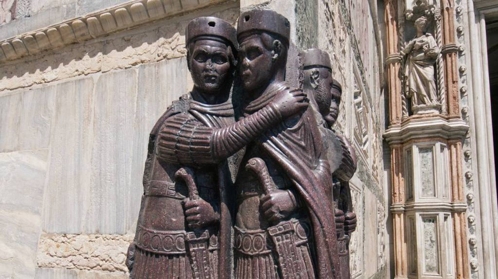 La risposta ce la restituisce il piccolo gruppo scultoreo dei tetrarchi, posto nei pressi della Porta della Carta del Palazzo Ducale. Questo altorilievo potrebbe sembrare una tra le migliaia di opere d’arte giunte fino a noi dal mondo antico, ma la pietra di cui è fatta ci deve convincere del contrario: il porfido, era infatti il materiale usato per le raffigurazioni dei soli imperatori (che ne possedevano le cave), vista la sua somiglianza con la porpora. Il gruppo dei tetrarchi presenta quattro imperatori ben identificabili: Diocleziano, Massimiano, Costanzo Cloro e Galerio, tutti e quattro collegabili al periodo noto come Tetrarchia. Tutto era partito con il primo di questi sovrani che, salito al potere dopo l’ennesimo scontro tra generali in lotta per il trono imperiale, cercò di trovare una soluzione ai due maggiori problemi dell’impero, cioè le sanguinose successioni al potere e la pressione dei barbari ai confini. Il sistema creato da Diocleziano divideva l’impero in quattro grandi province, due dominate dagli Augusti Diocleziano e Massimiano, raffigurati con la barba per simboleggiare la loro maggioranza di età e i due dai giovani Cesari, Costanzo Cloro e Galerio, che sarebbero dovuti succedere ai primi due al momento della loro morte, scegliendo due nuovi Cesari, al fine di garantire una pacifica successione.