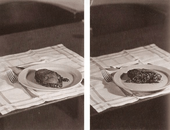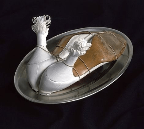 Un’altra importante esponente del Surrealismo fu la fotografa statunitense Lee Miller (1907-1977). Nonostante avesse realizzato numerosi reportage fotografici come corrispondente di guerra per gli Stati Uniti nel corso del secondo conflitto mondiale, l’artista è meglio conosciuta per essere stata assistente e compagna del fotografo Man Ray. Benché a Lee Miller si debba la diffusione delle prime immagini del campo di concentramento di Dachau nel corso della guerra, la sua produzione è stata quasi completamente dimenticata prima di venire riscoperta dai suoi familiari alcuni anni dopo la sua morte. Tra le sue opere meno note ma più eloquenti si trovano le fotografie di un seno femminile servito su un piatto di ceramica. Lee Miller realizzò questi scatti nel 1930 in seguito alla mastectomia di una sua amica, di cui conservò il seno reciso per realizzare un’opera anticipatrice di alcune soluzioni che Meret Oppenheim avrebbe adottato pochi anni dopo. L’accostamento dell’attributo femminile alla dimensione della cucina, più precisamente all’atto del servire e consumare un alimento, suggerisce una critica dell’artista alla pratica maschile di relegare la donna al ruolo di cuoca e casalinga, nonché alla tendenza a sessualizzarne la figura e a farne oggetto di desideri feticisti.