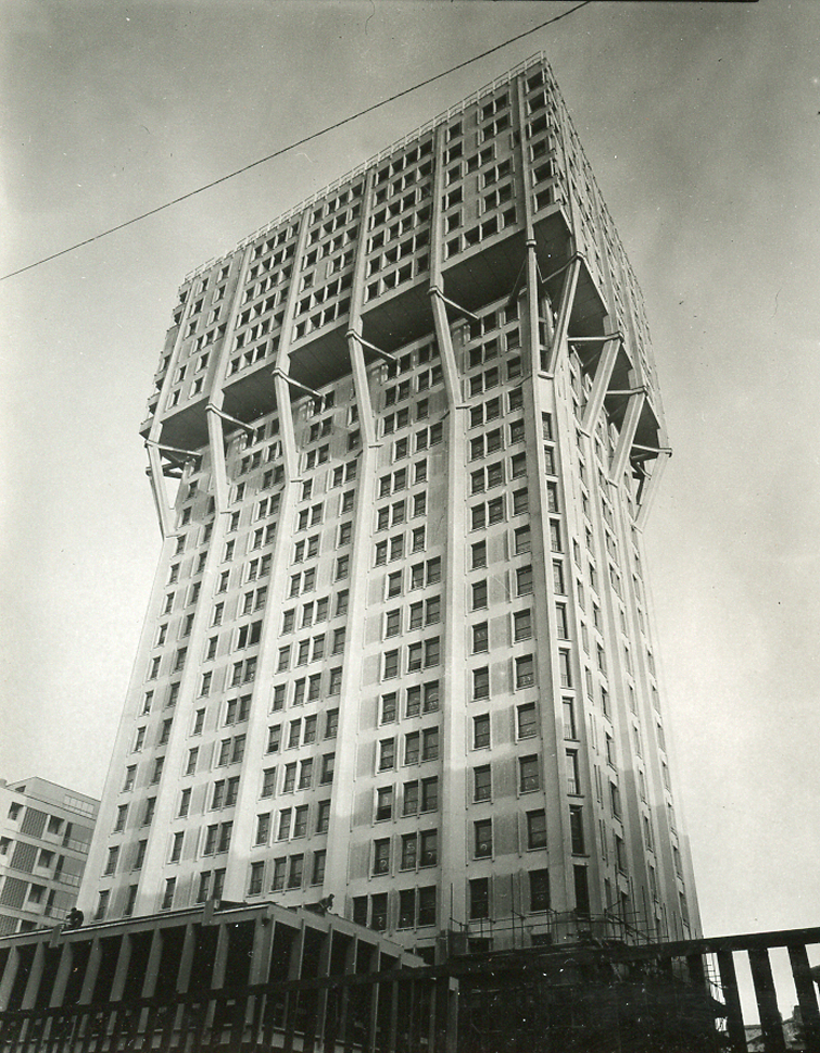 Foto di Paolo Monti (Servizio Fotografico, Milano 1956): “Ansicht von unten”, “Der Turm im Bau, vom Dach des Mailander Doms aus gesehen”, “Gerüste und Rohbau”.