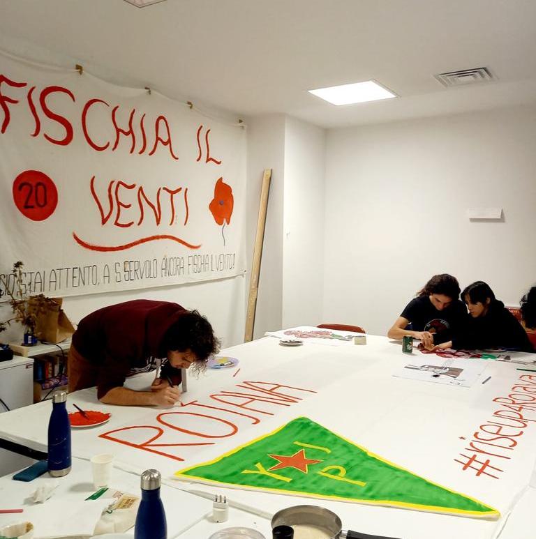 IN PRIMA LINEA Tempo di lettura: 7 minuti Roma, 26 novembre: mentre più di centomila persone passano in corteo nelle strade della capitale per la manifestazione nazionale chiamata da NonUnaDiMeno, tre ragazzi e una bambina da un balcone calano uno striscione che recita “DEFEND ROJAVA. Jin, Jiyan, Azadî”. Napoli, 30 novembre: decine di persone bloccano il banco check-in della Turkish Airlines dell’aeroporto cittadino con uno … Continua a leggere Controventi dal Rojava
